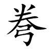 7. Một âm là “quyến”. (Động) Cuốn, cuộn. § Thông 捲. ◎Như: “bả trúc liêm tử quyến khởi lai” 把竹簾子捲起來 cuốn mành lại, “xa quyến khởi trần thổ” 車卷起塵土 xe cuốn theo bụi.